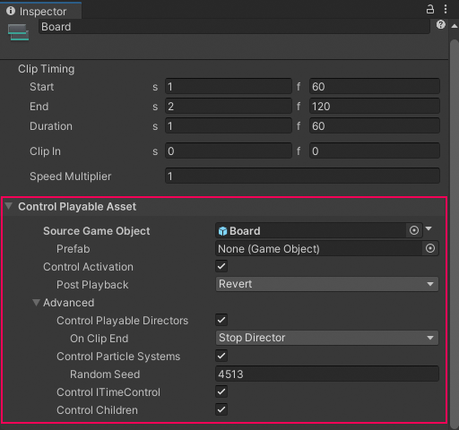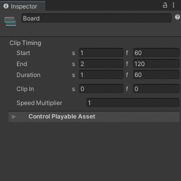 |**Speed Multiplier**|A speed multiplier that affects the playback speed of the Control clip. This value must be greater than 0. The Speed Multiplier property only affects Particle Systems and Sub-Timeline instances.|